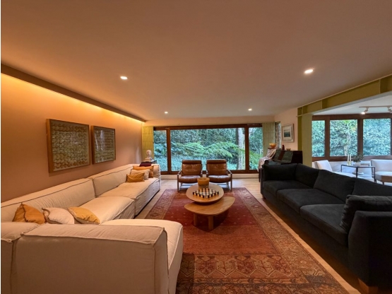 Grandes ventanales que conectan con un entorno profundamente verde, luz natural abundante y una atmósfera serena que se siente desde el primer momento.
